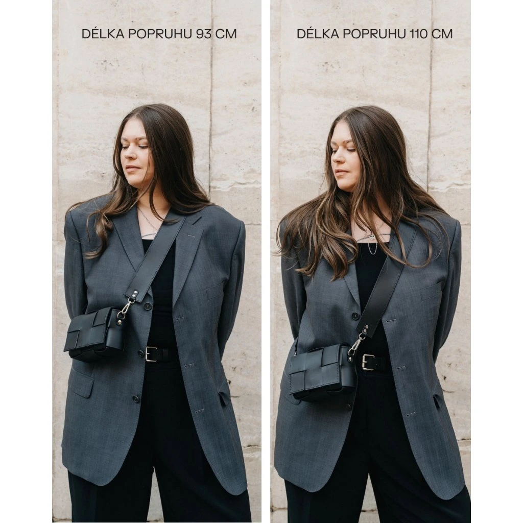 Vyberte správnou délku popruhu podle toho, jak vysoko/nízko chcete kabelku nosit. Pro osoby s výškou nad 180 cm doporučuji délku popruhu velikosti M. Modelka měří 172 cm a má popruh velikosti S.