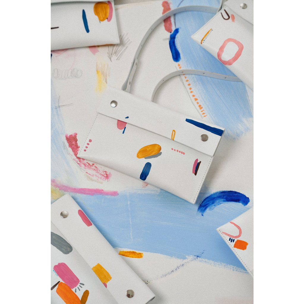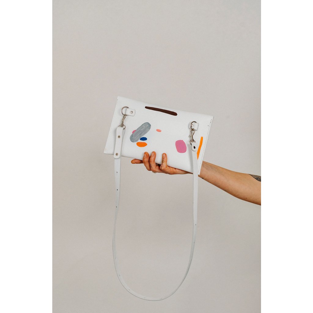 Limitovaná kabelka ze spolupráce s Danielou Klečackou vznikla z touhy propojit poctivé řemeslo s volnou malbou. Minimalistická kožená kabelka se stala plátnem pro autorský motiv Daniely. Každý kus je malý originál plný energie a radosti z barvy.