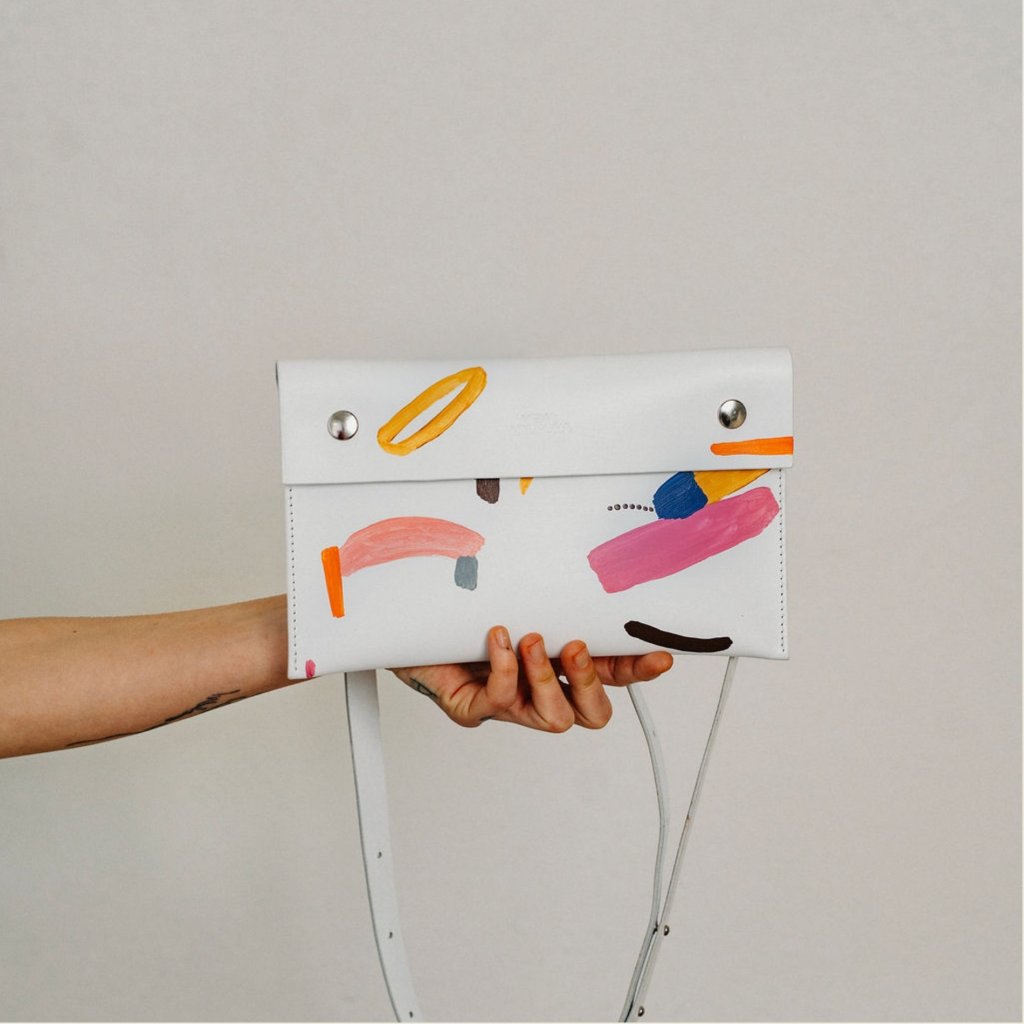 Limitovaná kabelka ze spolupráce s Danielou Klečackou vznikla z touhy propojit poctivé řemeslo s volnou malbou. Minimalistická kožená kabelka se stala plátnem pro autorský motiv Daniely. Každý kus je malý originál plný energie a radosti z barvy.