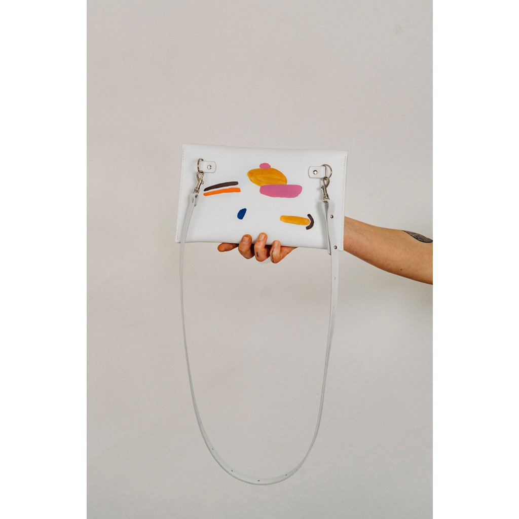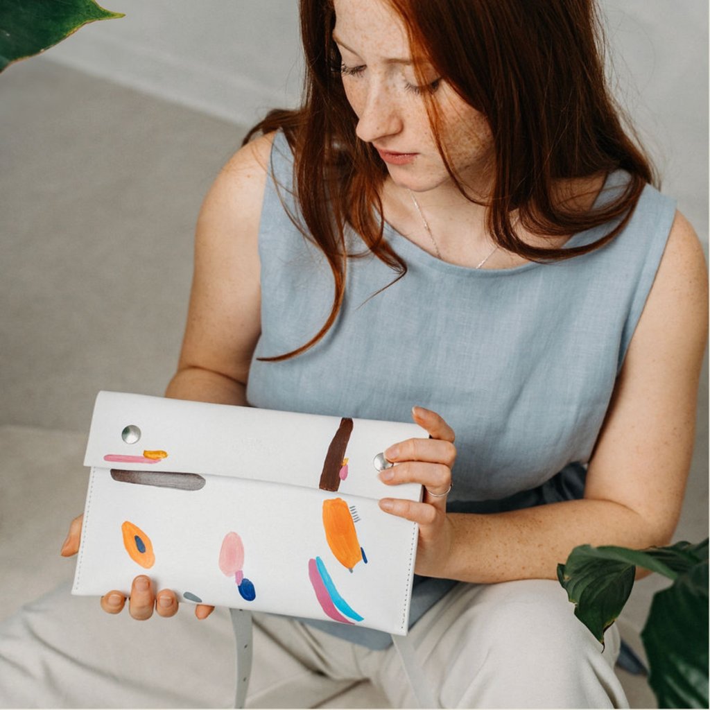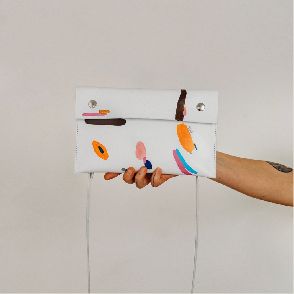 Limitovaná kabelka ze spolupráce s Danielou Klečackou vznikla z touhy propojit poctivé řemeslo s volnou malbou. Minimalistická kožená kabelka se stala plátnem pro autorský motiv Daniely. Každý kus je malý originál plný energie a radosti z barvy.